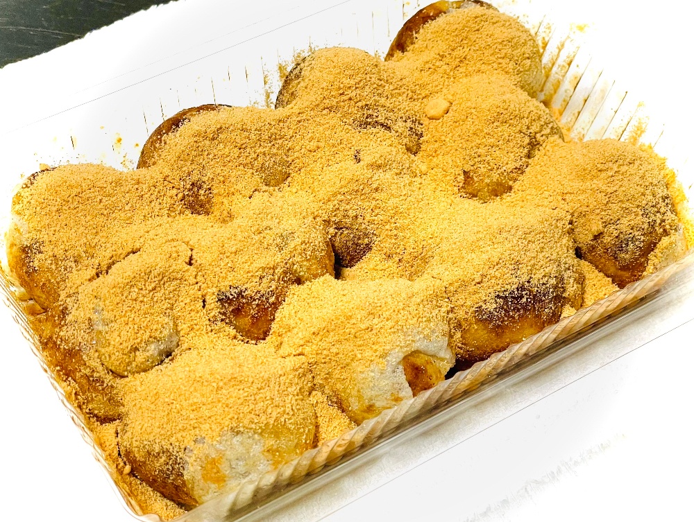 タコさんお留守シリーズ第二弾!!べべん!お月見シーズンの雰囲気漂わせやって来たモチモチのおもち焼きべべんっふんわり口溶け良くほんのり甘く仕立てた きな粉が埋め尽くす主役はどちらだ!?さぁムチムチお餅か?さぁさぁ無限きな粉か?食べてみなきゃ〜分からない。一度は食べなきゃ人生を損をする。「おもち焼き 〜甘美な きな粉〜」を食べた貴方が…そう!主役です!!べっべべんっ